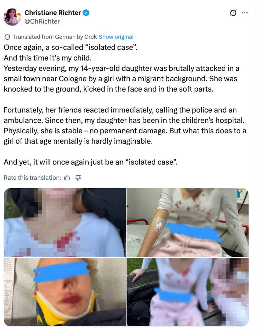 Ένα ανησυχητικό περιστατικό έρχεται στο φως στη Γερμανία, με τη μητέρα μιας 14χρονης, ονόματι Ρόνια, να δημοσιεύει σοκαριστικές φωτογραφίες της κόρης της στο X (πρώην Twitter), όπου φαίνεται αιμόφυρτη και ξυλοκοπημένη. Σύμφωνα με την ίδια, το κορίτσι δέχτηκε βίαιη επίθεση σε μικρή πόλη κοντά στην Κολωνία από μια συνομήλική της «με μεταναστευτικό υπόβαθρο». Η μητέρα περιγράφει ότι η κόρη της ρίχτηκε στο έδαφος, δέχτηκε κλωτσιές στο πρόσωπο και στο σώμα, ενώ σώθηκε χάρη στην άμεση επέμβαση φίλων της που κάλεσαν αστυνομία και ασθενοφόρο. Η Ρόνια νοσηλεύεται σε παιδιατρικό νοσοκομείο και, αν και είναι εκτός κινδύνου, οι ψυχολογικές επιπτώσεις θεωρούνται σοβαρές. Η αρχική ανάρτηση λογοκρίθηκε από την πλατφόρμα, πιθανόν έπειτα από αίτημα γερμανικών ή ευρωπαϊκών αρχών.