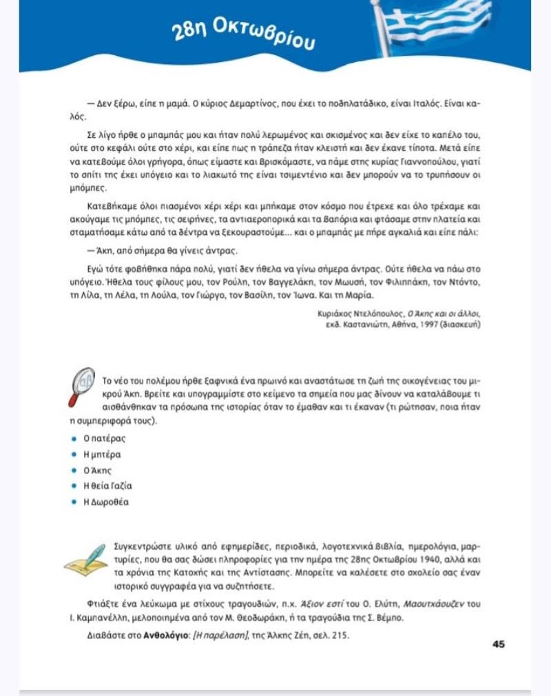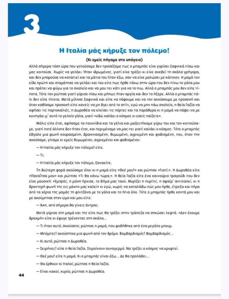 Το κείμενο «Η Ιταλία μάς κήρυξε τον πόλεμο κι εμείς πήγαμε στο υπόγειο!», που περιλαμβάνεται στο βιβλίο γλώσσας της Ε’ Δημοτικού, παρουσιάζει με ηττοπάθεια και φόβο μία από τις πιο ένδοξες στιγμές της ελληνικής ιστορίας.