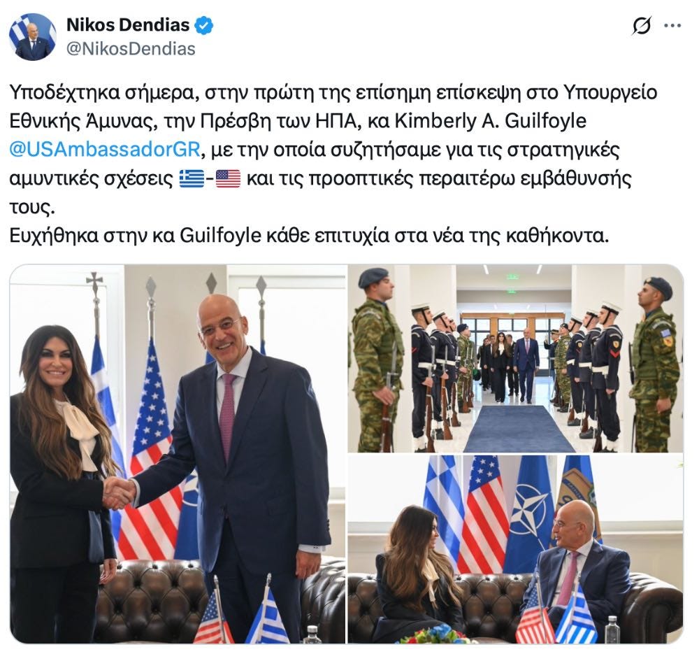 Ο Υπουργός Εθνικής Άμυνας, Νίκος Δένδιας, υποδέχθηκε σήμερα στην Αθήνα την Πρέσβειρα των ΗΠΑ, Κίμπερλι Γκιλφόιλ, κατά την πρώτη επίσημη επίσκεψή της στο υπουργείο.
