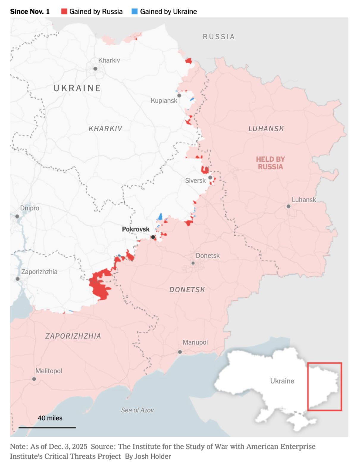 Ωστόσο, ο ρυθμός της ρωσικής προέλασης επιταχύνεται. Τον Νοέμβριο, οι ρωσικές δυνάμεις κατέλαβαν περίπου 505 τετραγωνικά χιλιόμετρα εδάφους, σχεδόν τα διπλάσια σε σχέση με τον Οκτώβριο, σύμφωνα με ουκρανικούς χάρτες του πεδίου μάχης.