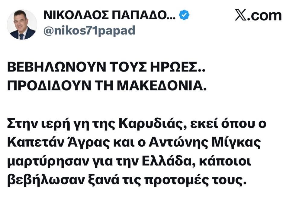 Νίκος Παπαδόπουλος: «Βεβηλώνουν τις προτομές των Μακεδονομάχων»