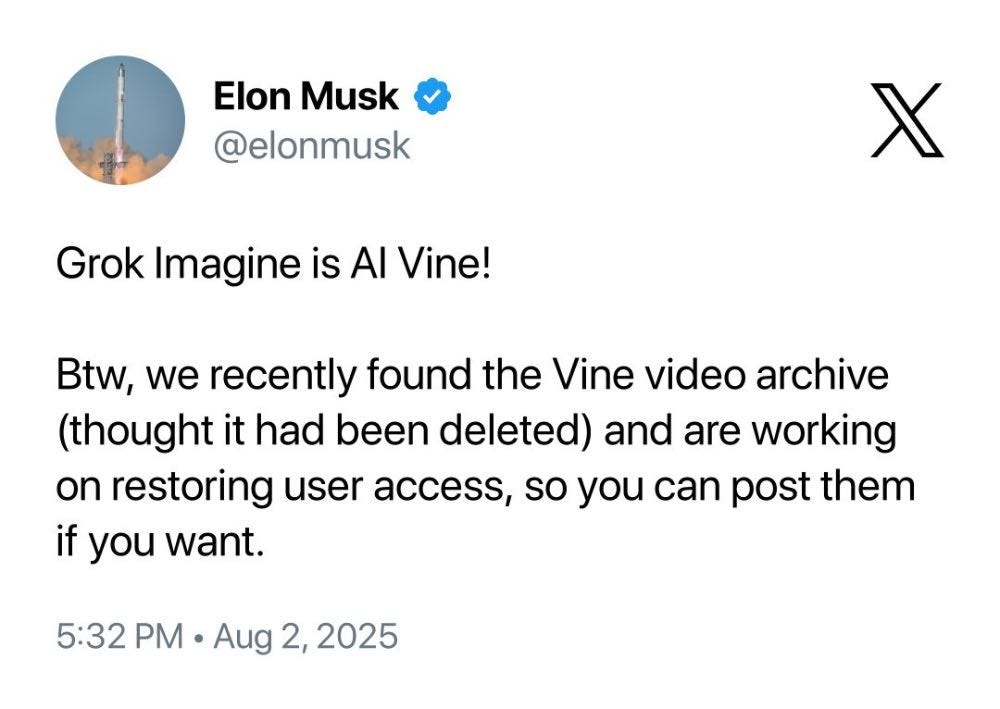 Η εταιρεία τεχνητής νοημοσύνης του Έλον Μασκ, xAI, ανακοίνωσε την επαναφορά του αρχείου βίντεο του Vine, σηματοδοτώντας μια εντυπωσιακή επιστροφή της πλατφόρμας που είχε σταματήσει τη λειτουργία της το 2019. Η κίνηση αυτή έρχεται λίγο μετά την εξαγορά της X Corp από την xAI, στις 28 Μαρτίου 2025, και αποτελεί μέρος ενός ευρύτερου οράματος για την ενσωμάτωση της τεχνητής νοημοσύνης στα κοινωνικά μέσα. Η ιδέα της αναβίωσης του Vine είχε ήδη αναζωπυρωθεί το 2022, όταν ο Μασκ διεξήγαγε δημοσκόπηση στο Twitter, στην οποία οι χρήστες εκφράστηκαν θετικά για την επιστροφή της πλατφόρμας.